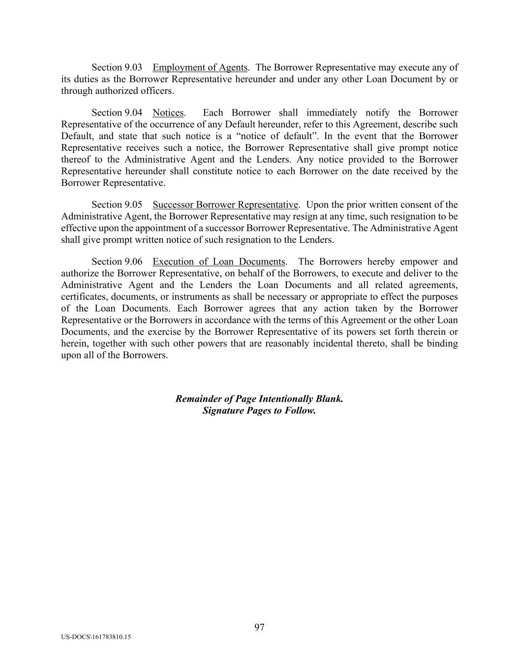 97 US-DOCS\161783810.15 Section 9.03 Employment of Agents. The Borrower Representative may execute any of its duties as the Borrower Representative hereunder and under any other Loan Document by or through authorized officers. Section 9.04 Notices. Each Borrower shall immediately notify the Borrower Representative of the occurrence of any Default hereunder, refer to this Agreement, describe such Default, and state that such notice is a “notice of default”. In the event that the Borrower Representative receives such a notice, the Borrower Representative shall give prompt notice thereof to the Administrative Agent and the Lenders. Any notice provided to the Borrower Representative hereunder shall constitute notice to each Borrower on the date received by the Borrower Representative. Section 9.05 Successor Borrower Representative. Upon the prior written consent of the Administrative Agent, the Borrower Representative may resign at any time, such resignation to be effective upon the appointment of a successor Borrower Representative. The Administrative Agent shall give prompt written notice of such resignation to the Lenders. Section 9.06 Execution of Loan Documents. The Borrowers hereby empower and authorize the Borrower Representative, on behalf of the Borrowers, to execute and deliver to the Administrative Agent and the Lenders the Loan Documents and all related agreements, certificates, documents, or instruments as shall be necessary or appropriate to effect the purposes of the Loan Documents. Each Borrower agrees that any action taken by the Borrower Representative or the Borrowers in accordance with the terms of this Agreement or the other Loan Documents, and the exercise by the Borrower Representative of its powers set forth therein or herein, together with such other powers that are reasonably incidental thereto, shall be binding upon all of the Borrowers. Remainder of Page Intentionally Blank. Signature Pages to Follow.