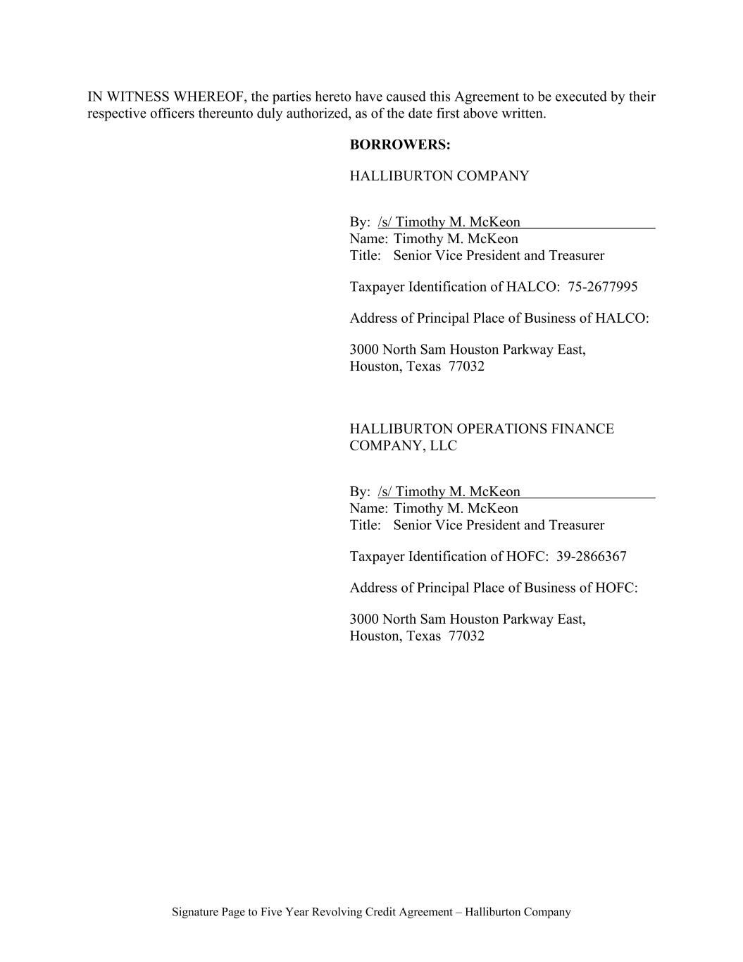 Signature Page to Five Year Revolving Credit Agreement – Halliburton Company IN WITNESS WHEREOF, the parties hereto have caused this Agreement to be executed by their respective officers thereunto duly authorized, as of the date first above written. BORROWERS: HALLIBURTON COMPANY By: /s/ Timothy M. McKeon Name: Timothy M. McKeon Title: Senior Vice President and Treasurer Taxpayer Identification of HALCO: 75-2677995 Address of Principal Place of Business of HALCO: 3000 North Sam Houston Parkway East, Houston, Texas 77032 HALLIBURTON OPERATIONS FINANCE COMPANY, LLC By: /s/ Timothy M. McKeon Name: Timothy M. McKeon Title: Senior Vice President and Treasurer Taxpayer Identification of HOFC: 39-2866367 Address of Principal Place of Business of HOFC: 3000 North Sam Houston Parkway East, Houston, Texas 77032