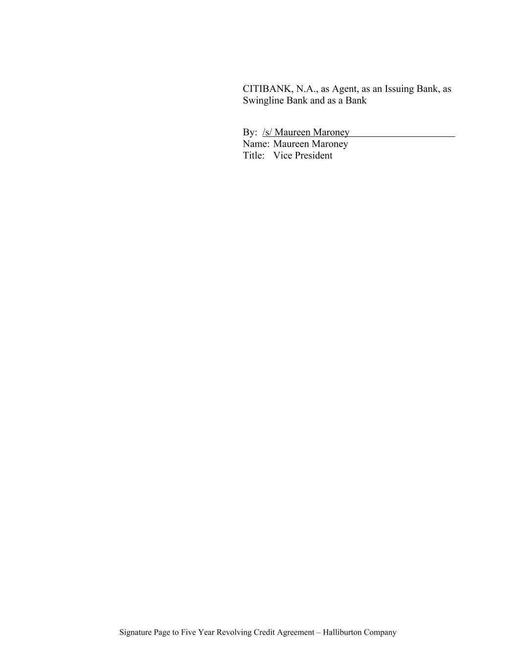 Signature Page to Five Year Revolving Credit Agreement – Halliburton Company CITIBANK, N.A., as Agent, as an Issuing Bank, as Swingline Bank and as a Bank By: /s/ Maureen Maroney Name: Maureen Maroney Title: Vice President