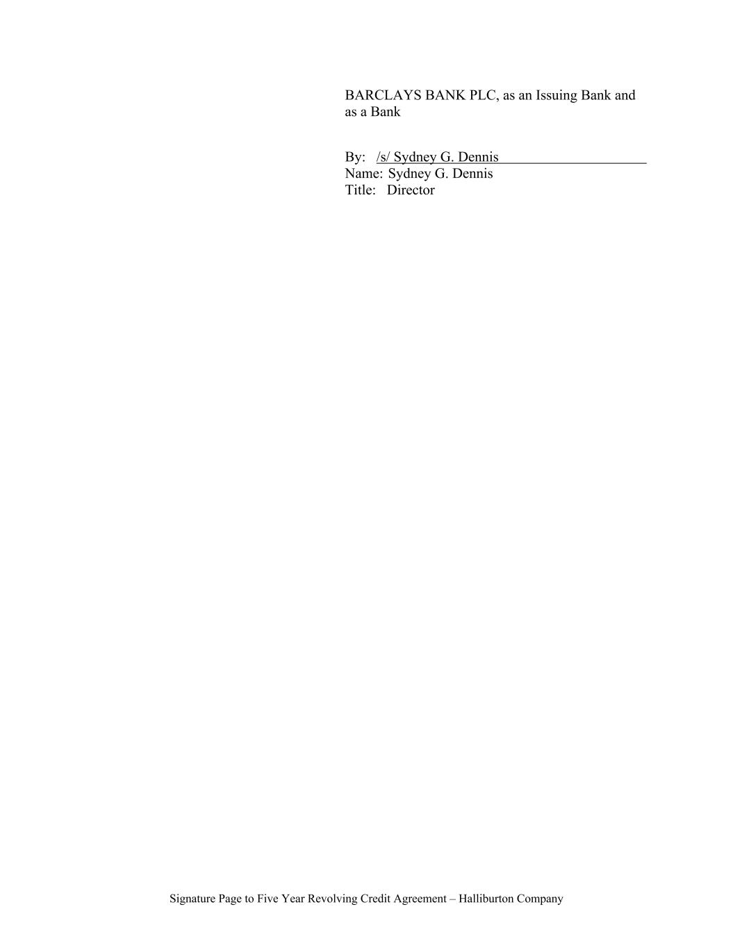 Signature Page to Five Year Revolving Credit Agreement – Halliburton Company BARCLAYS BANK PLC, as an Issuing Bank and as a Bank By: /s/ Sydney G. Dennis Name: Sydney G. Dennis Title: Director