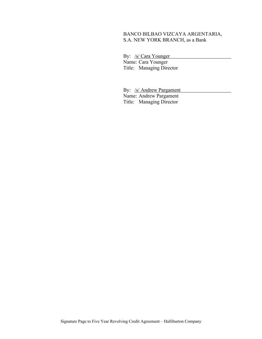 Signature Page to Five Year Revolving Credit Agreement – Halliburton Company BANCO BILBAO VIZCAYA ARGENTARIA, S.A. NEW YORK BRANCH, as a Bank By: /s/ Cara Younger Name: Cara Younger Title: Managing Director By: /s/ Andrew Pargament Name: Andrew Pargament Title: Managing Director
