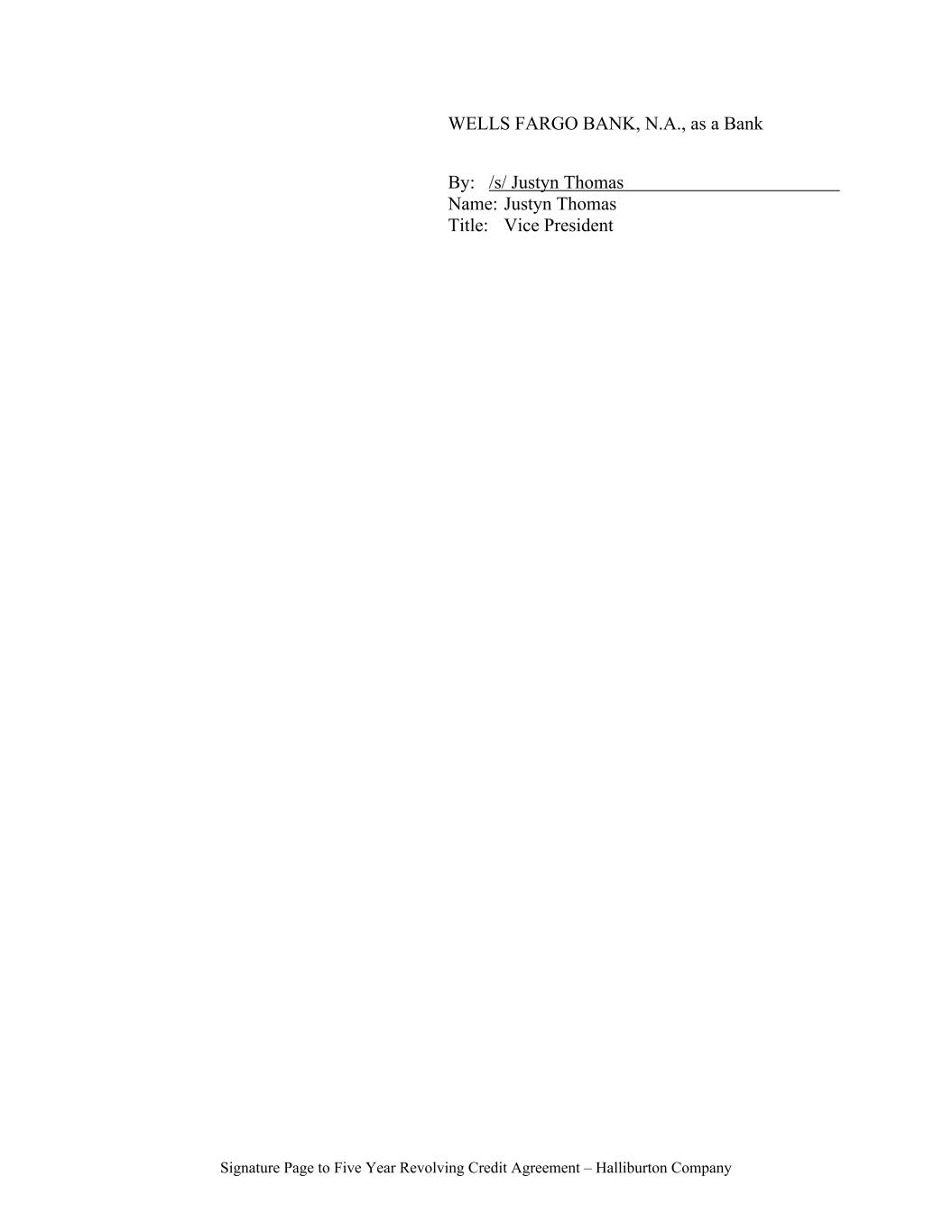 Signature Page to Five Year Revolving Credit Agreement – Halliburton Company WELLS FARGO BANK, N.A., as a Bank By: /s/ Justyn Thomas Name: Justyn Thomas Title: Vice President