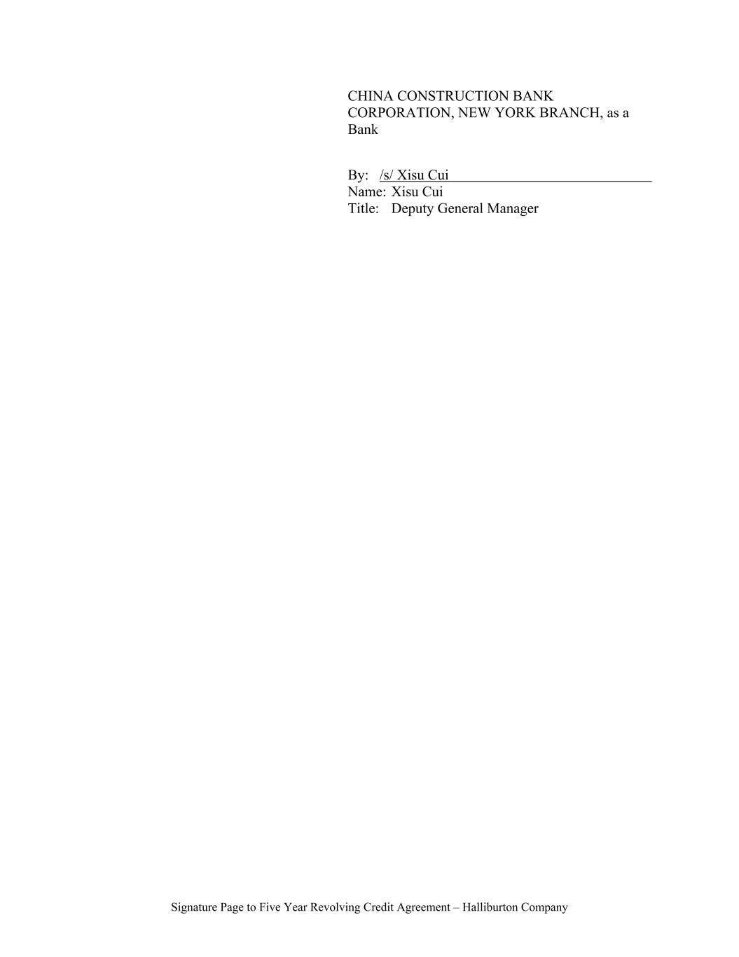 Signature Page to Five Year Revolving Credit Agreement – Halliburton Company CHINA CONSTRUCTION BANK CORPORATION, NEW YORK BRANCH, as a Bank By: /s/ Xisu Cui Name: Xisu Cui Title: Deputy General Manager