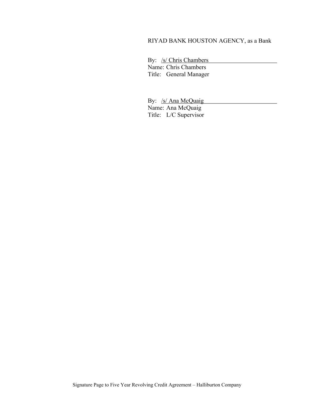 Signature Page to Five Year Revolving Credit Agreement – Halliburton Company RIYAD BANK HOUSTON AGENCY, as a Bank By: /s/ Chris Chambers Name: Chris Chambers Title: General Manager By: /s/ Ana McQuaig Name: Ana McQuaig Title: L/C Supervisor