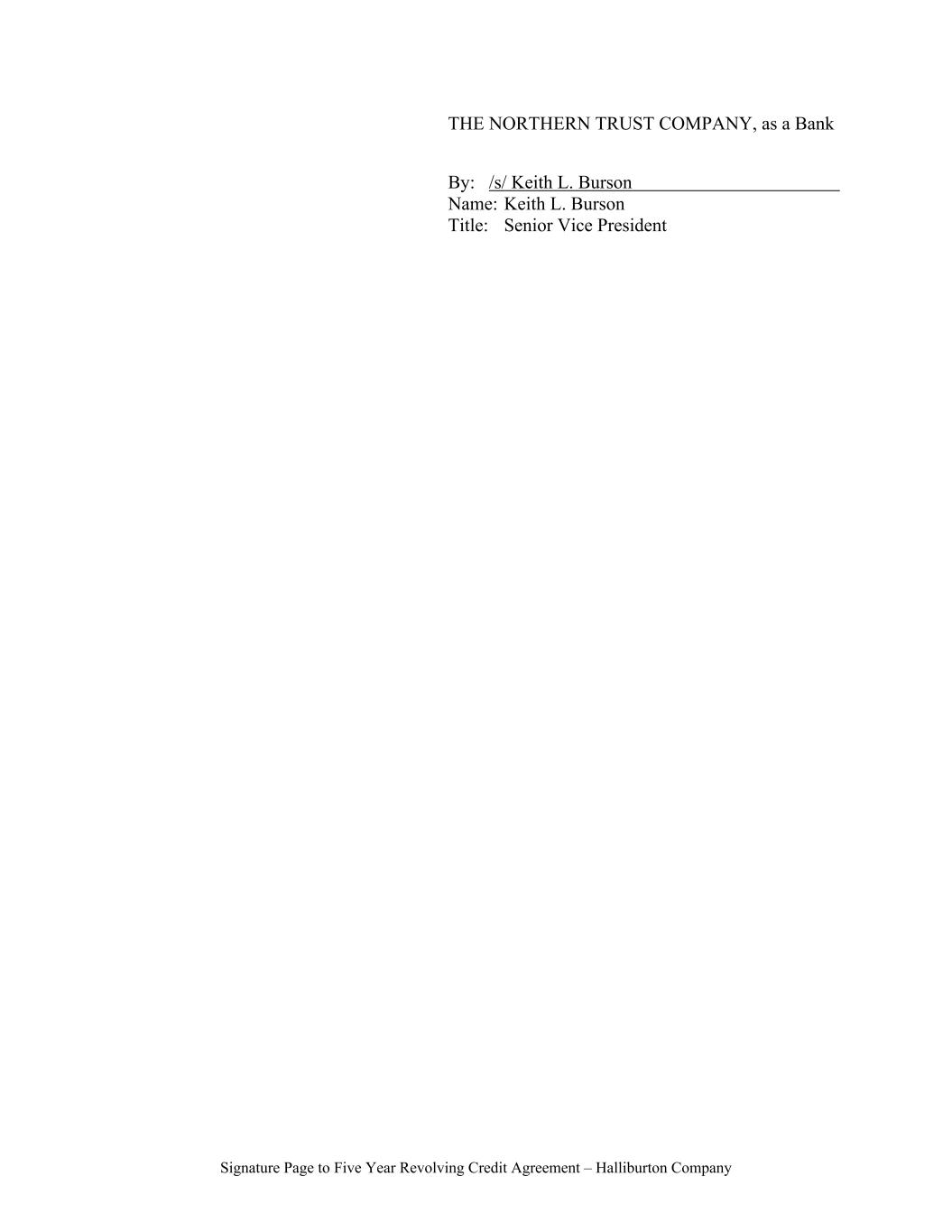 Signature Page to Five Year Revolving Credit Agreement – Halliburton Company THE NORTHERN TRUST COMPANY, as a Bank By: /s/ Keith L. Burson Name: Keith L. Burson Title: Senior Vice President