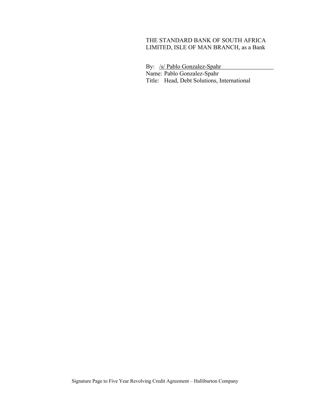 Signature Page to Five Year Revolving Credit Agreement – Halliburton Company THE STANDARD BANK OF SOUTH AFRICA LIMITED, ISLE OF MAN BRANCH, as a Bank By: /s/ Pablo Gonzalez-Spahr Name: Pablo Gonzalez-Spahr Title: Head, Debt Solutions, International
