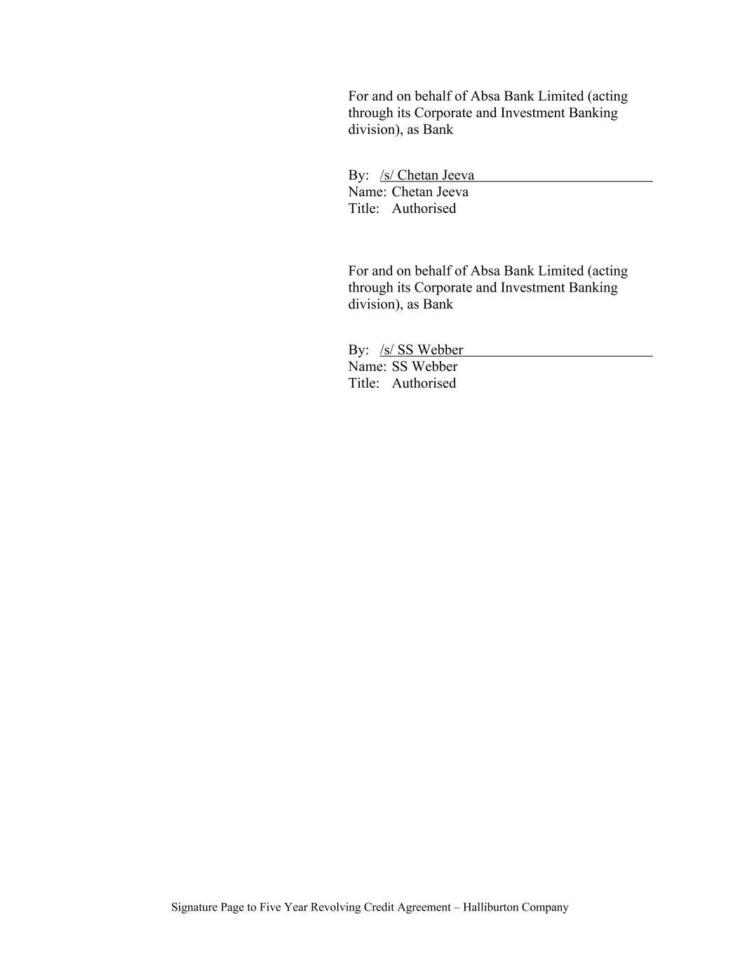 Signature Page to Five Year Revolving Credit Agreement – Halliburton Company For and on behalf of Absa Bank Limited (acting through its Corporate and Investment Banking division), as Bank By: /s/ Chetan Jeeva Name: Chetan Jeeva Title: Authorised For and on behalf of Absa Bank Limited (acting through its Corporate and Investment Banking division), as Bank By: /s/ SS Webber Name: SS Webber Title: Authorised