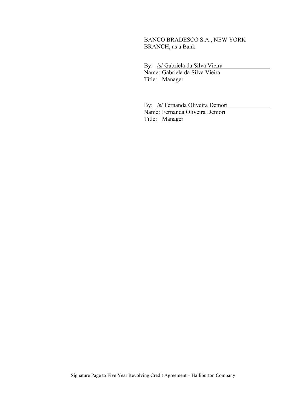 Signature Page to Five Year Revolving Credit Agreement – Halliburton Company BANCO BRADESCO S.A., NEW YORK BRANCH, as a Bank By: /s/ Gabriela da Silva Vieira Name: Gabriela da Silva Vieira Title: Manager By: /s/ Fernanda Oliveira Demori Name: Fernanda Oliveira Demori Title: Manager