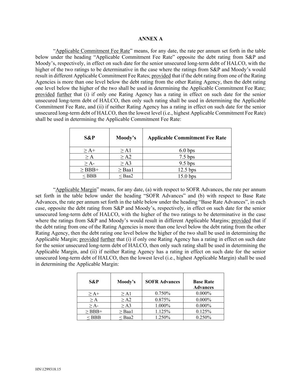 HN\1299318.15 ANNEX A “Applicable Commitment Fee Rate” means, for any date, the rate per annum set forth in the table below under the heading “Applicable Commitment Fee Rate” opposite the debt rating from S&P and Moody’s, respectively, in effect on such date for the senior unsecured long-term debt of HALCO, with the higher of the two ratings to be determinative in the case where the ratings from S&P and Moody’s would result in different Applicable Commitment Fee Rates; provided that if the debt rating from one of the Rating Agencies is more than one level below the debt rating from the other Rating Agency, then the debt rating one level below the higher of the two shall be used in determining the Applicable Commitment Fee Rate; provided further that (i) if only one Rating Agency has a rating in effect on such date for the senior unsecured long-term debt of HALCO, then only such rating shall be used in determining the Applicable Commitment Fee Rate, and (ii) if neither Rating Agency has a rating in effect on such date for the senior unsecured long-term debt of HALCO, then the lowest level (i.e., highest Applicable Commitment Fee Rate) shall be used in determining the Applicable Commitment Fee Rate: S&P Moody’s Applicable Commitment Fee Rate ≥ A+ ≥ A1 6.0 bps ≥ A ≥ A2 7.5 bps ≥ A- ≥ A3 9.5 bps ≥ BBB+ ≥ Baa1 12.5 bps < BBB < Baa2 15.0 bps “Applicable Margin” means, for any date, (a) with respect to SOFR Advances, the rate per annum set forth in the table below under the heading “SOFR Advances” and (b) with respect to Base Rate Advances, the rate per annum set forth in the table below under the heading “Base Rate Advances”, in each case, opposite the debt rating from S&P and Moody’s, respectively, in effect on such date for the senior unsecured long-term debt of HALCO, with the higher of the two ratings to be determinative in the case where the ratings from S&P and Moody’s would result in different Applicable Margins; provided that if the debt rating from one of the Rating Agencies is more than one level below the debt rating from the other Rating Agency, then the debt rating one level below the higher of the two shall be used in determining the Applicable Margin; provided further that (i) if only one Rating Agency has a rating in effect on such date for the senior unsecured long-term debt of HALCO, then only such rating shall be used in determining the Applicable Margin, and (ii) if neither Rating Agency has a rating in effect on such date for the senior unsecured long-term debt of HALCO, then the lowest level (i.e., highest Applicable Margin) shall be used in determining the Applicable Margin: S&P Moody’s SOFR Advances Base Rate Advances ≥ A+ ≥ A1 0.750% 0.000% ≥ A ≥ A2 0.875% 0.000% ≥ A- ≥ A3 1.000% 0.000% ≥ BBB+ ≥ Baa1 1.125% 0.125% < BBB < Baa2 1.250% 0.250%